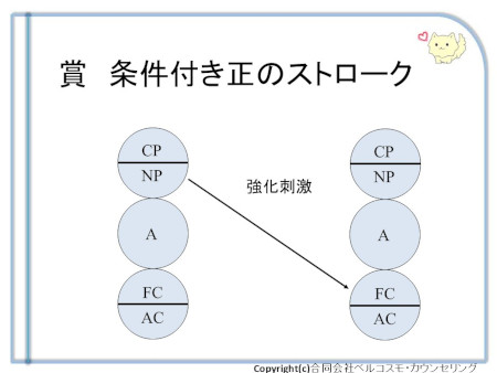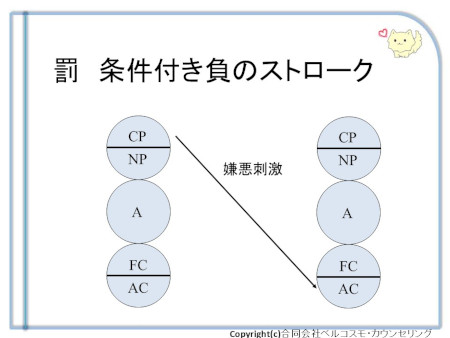 本屋さんで売っている行動分析の本には、他の心理学(特に「無意識を扱う心理学)のことがあまり書かれていないことが多いようです。 確かに日本に行動療法を導入された大先生方には、精神分析などについて反感を持つ人も少なくはありませんでした。 しかし行動分析は、因果関係よりも未来においてどうするかに重点を置くところが、家族療法やアドラー心理学とかなり志向が似ていますし、精神分析から発展した交流分析を筆者は説明に使うこともあります。 例えば「賞(好子)」と「罰(嫌子)」で言うと、交流分析の自我状態の「やりとり」で説明した場合は下図のようになります。 (交流分析について興味がお有りでしたら、当協会のこのホームページのMENUから「交流分析エゴグラム」を選択してご覧ください)